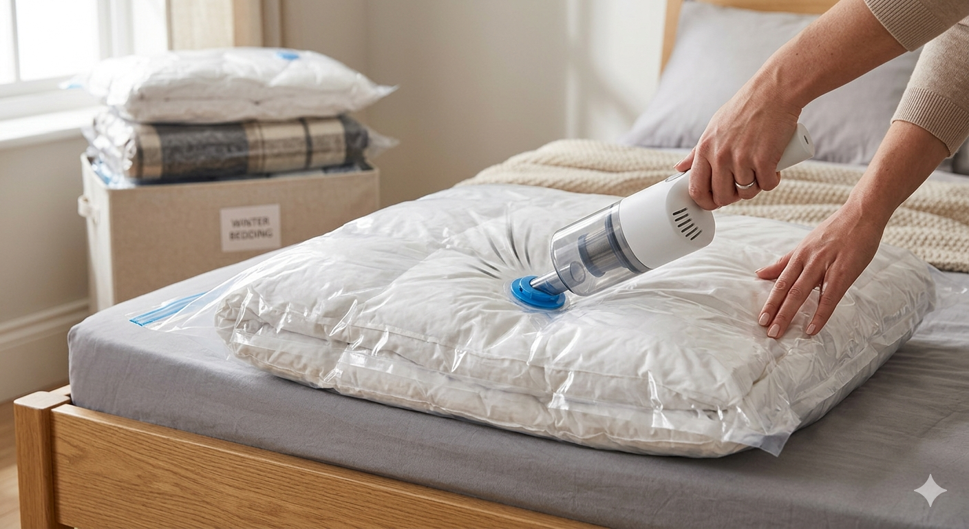 많은 분이 겨울 이불을 넣을 때 단순히 압축팩에 넣고 공기를 빼는 것에만 집중하시는데요. 사실 가장 중요한 것은 압축 전 세탁과 건조 상태입니다. 겨울 이불은 부피가 커서 속통까지 완전히 마르지 않은 상태로 압축하면, 다음 해에 꺼냈을 때 퀴퀴한 냄새와 곰팡이를 마주하게 될 확률이 매우 높습니다.