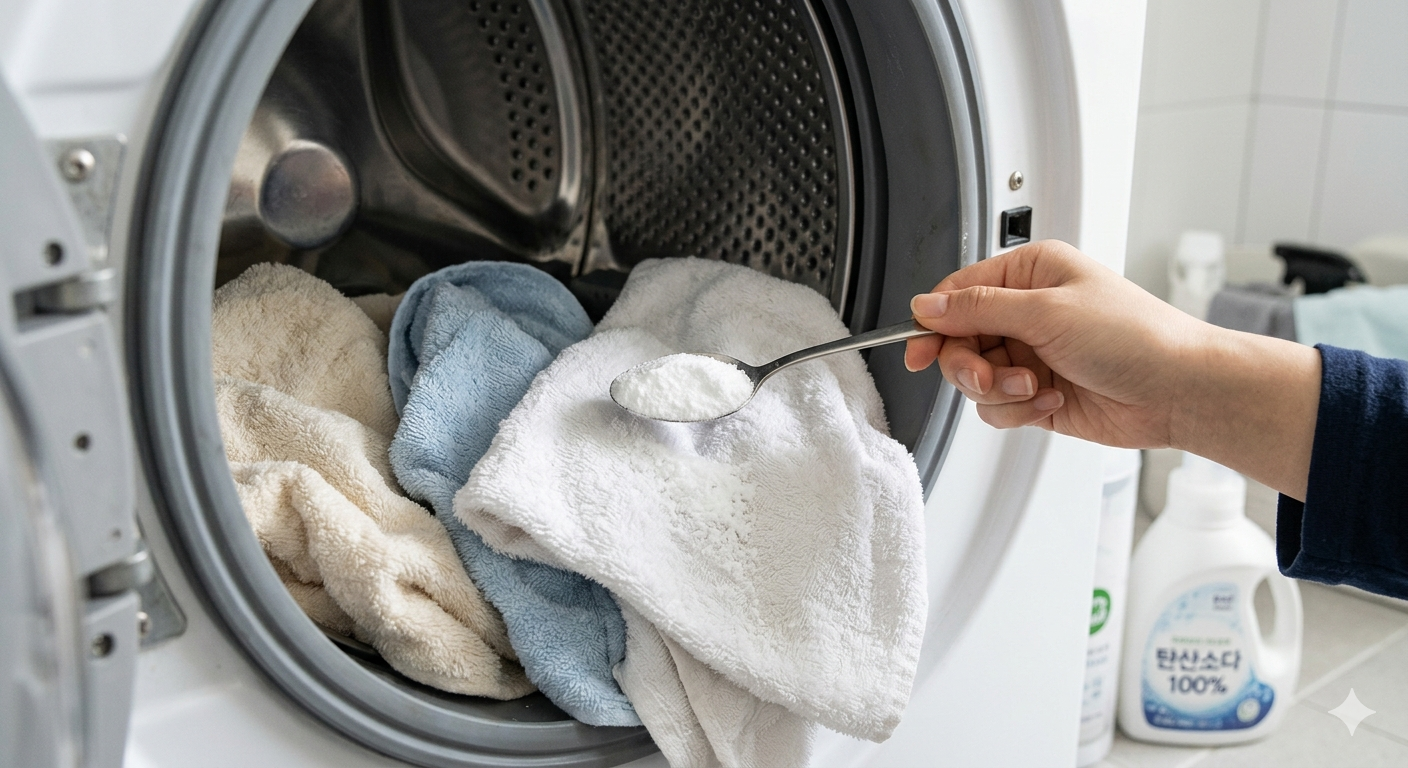 수건에서 냄새가 나는 이유는 섬유 사이에 박힌 단백질 노폐물과 세균 때문입니다. 일반 세제만으로는 이 균들을 완전히 제거하기 어렵습니다. 세탁기에 넣기 전, 60도 정도의 온수에 과탄산소다를 종이컵 반 컵 정도 녹여주세요.